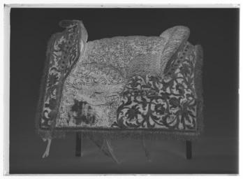 Keywords: Spannryttarsadel, Frankrike , 1660-1670-talet - Livrustkammaren - 19121-negative.tif LSH artwork sv Sadel överklädd med röd sammet Rektangulärea kappor kantade med frans av guld- och silvertråd samt kraftiga glesa rank- och blombroderier I sitsen och på bommarnas insidor tunna rankor av naturfärgad tråd Frambom 420 mm bred 90 mm hög Bakbom 400 mm bred 110 mm hög Bakom bommen 7+7 blomformade tännlikor framför frambommen 9+8 likadana Sadelknapp framåt utdragen kannelerad Svagt kannelyr pärlbård Vid sidan av sadelknappen en förgylld mässingsring Bom överklädd med vitt skinn på ovansidan och med brun väv på undersidan 5 stroppar på vardera sidan för sadelgjord Bossor av naturfärgat linne kantade med röda ylleband original caption Karl XI s kröning ca other date - 1660 1670 size mm 580 g 5980 size mm 330 sits LRK Karl XI av Sverige place of origin original filename LN_B17122_020002 48166 inventory number LRK 11562 19121 CC0 Spannryttarsadel Frankrike 1660-1670-talet - Livrustkammaren - 19121 tif |