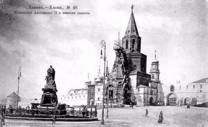 Keywords: Spasskaya tower and Alexander II monument in Kazan.jpg ru Памятник Александ у II и военная це ковь Спаса е укотво ного Об аза п и Спасской башне казанского к емля postcard Author < 1918 Monuments and memorials in Kazan Kazan Kremlin May Day Square Kazan Spasskaya Tower of Kazan Kremlin PD-old