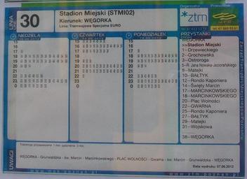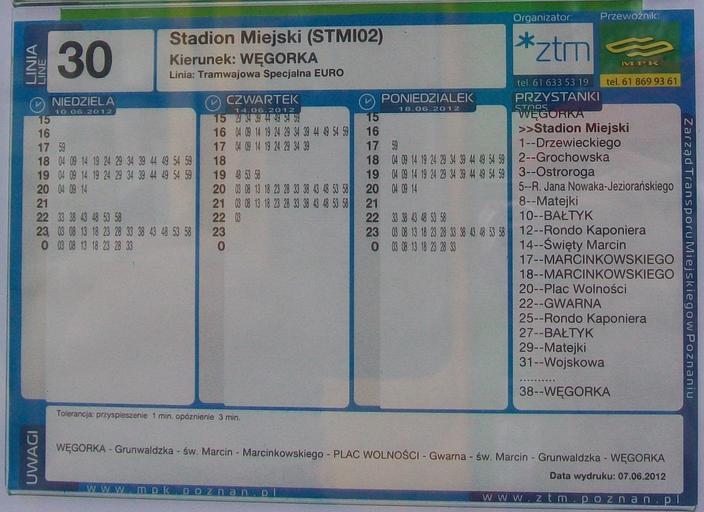Keywords: Special tram line timetable during Euro 2012 in Poznań.jpg pl Rozkład jazdy specjalnej linii tramwajowej nr 30 podczas Euro 2012 w Poznaniu; zdjęcie zrobione na przystanku pod stadionem en Special tram line timetable during Euro 2012 in Poznań 2012-06-14 own anonymous author cc-zero UEFA Euro 2012 Poznań |