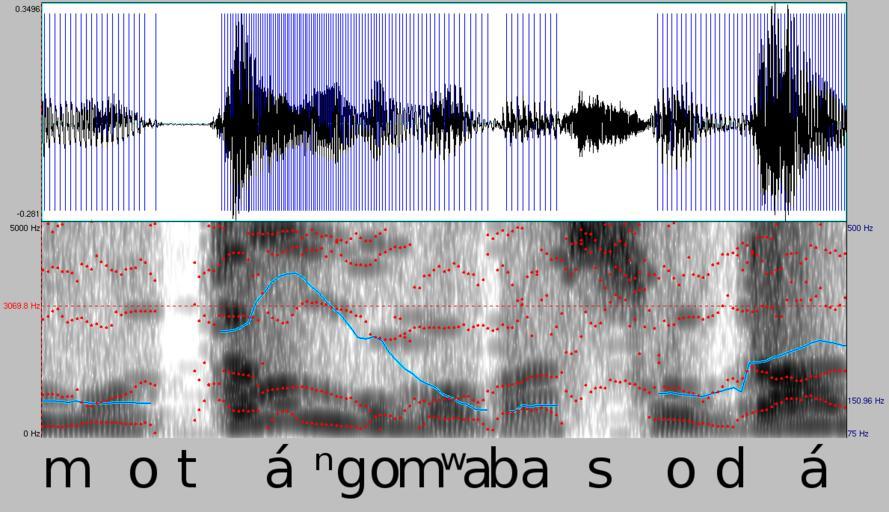 Keywords: Spectrogram - motángo mwa basodá.png Spectrogram of Lingala motángo mwa basodá Standard lingala pronounced by a female speaker light blue line pitch dark blue lines pulses red dots formants made with Praat from a Radio Okapi news report 2007-04-23 Denis Jacquerye User Moyogo Voice spectrograms Formants Audio graphs Praat |
