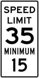 Keywords: Speed Limit 35 Minimum 15 sign.svg 600 mm by 1200 mm 24 in by 48 in Combined Speed Limit sign made to the specifications of the http //mutcd fhwa dot gov/SHSm/regulatory pdf 2004 edition of Standard Highway Signs sign R2-4a Uses the http //www triskele com/fonts/index html Roadgeek 2005 fonts United States law does not permit the copyrighting of typeface designs and the fonts are meant to be copies of a U S Government-produced work anyway The outside border has a width of 1 1 mm and a color of black so it shows up; in reality signs have no outside border own Ltljltlj User Ltljltlj/Template minimum R2-4 - Minimum Speed 3515 15 number 35 number |