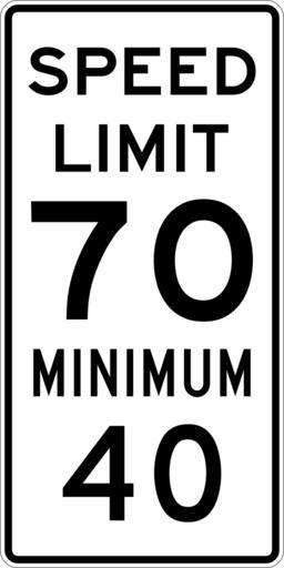 Keywords: Speed limit 70 minimum 40 sign.svg 600 mm by 1200 mm 24 in by 48 in Combined Speed Limit sign made to the specifications of the http //mutcd fhwa dot gov/SHSm/regulatory pdf 2004 edition of Standard Highway Signs sign R2-4a Uses the http //www triskele com/fonts/index html Roadgeek 2005 fonts United States law does not permit the copyrighting of typeface designs and the fonts are meant to be copies of a U S Government-produced work anyway The outside border has a width of 1 1 mm and a color of black so it shows up; in reality signs have no outside border own Ltljltlj User Ltljltlj/Template R2-4 - Minimum Speed 7040 40 number 70 number |