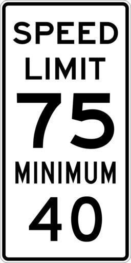 Keywords: Speed Limit 75 Minimum 40 sign.svg 600 mm by 1200 mm 24 in by 48 in Combined Speed Limit sign made to the specifications of the http //mutcd fhwa dot gov/SHSm/regulatory pdf 2004 edition of Standard Highway Signs sign R2-4a Uses the http //www triskele com/fonts/index html Roadgeek 2005 fonts United States law does not permit the copyrighting of typeface designs and the fonts are meant to be copies of a U S Government-produced work anyway The outside border has a width of 1 1 mm and a color of black so it shows up; in reality signs have no outside border own Ltljltlj User Ltljltlj/Template minimum R2-4 - Minimum Speed 7540 75 number 40 number |