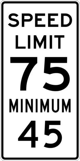 Keywords: Speed Limit 75 Minimum 45 sign.svg 600 mm by 1200 mm 24 in by 48 in Combined Speed Limit sign made to the specifications of the http //mutcd fhwa dot gov/SHSm/regulatory pdf 2004 edition of Standard Highway Signs sign R2-4a Uses the http //www triskele com/fonts/index html Roadgeek 2005 fonts United States law does not permit the copyrighting of typeface designs and the fonts are meant to be copies of a U S Government-produced work anyway The outside border has a width of 1 1 mm and a color of black so it shows up; in reality signs have no outside border own Ltljltlj User Ltljltlj/Template minimum R2-4 - Minimum Speed 7545 75 number 45 number |