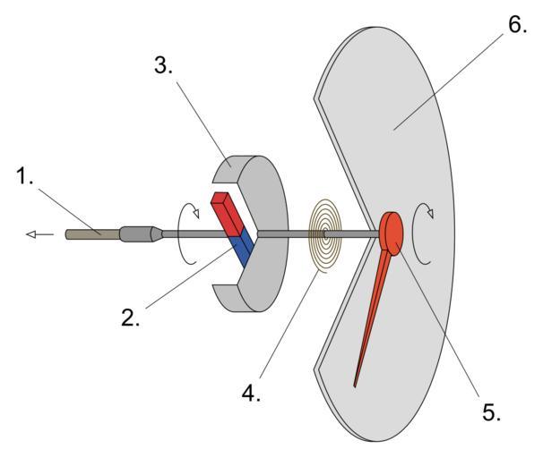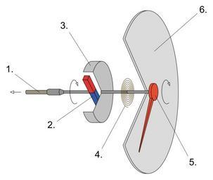 Keywords: Speedometer diagram.svg en Diagram of traditional eddy current speedometer 1 Rotating cable from vehicle's transmission 2 Rotating magnet 3 Speedcup 4 Torsion spring 5 Pointer 6 Dial fi Perinteisen nopeusmittarin toiminta 1 Pyörivä kaapeli ajoneuvon akselilta 2 Pyörivä magneetti 3 Alumiinikuppi 4 Palautusjousi 5 Osoitin 6 Mittaritaulu 2014-03-26 15 04 57 own Jam123 cc-zero Uploaded with UploadWizard Speed measurement |