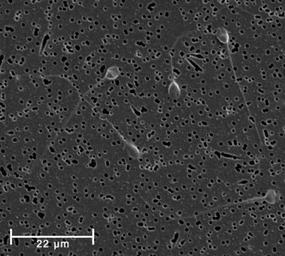 Keywords: Spermatozoa-human-1000x.jpg en Micrograph by scanning electron microscope SEM of human sperm cells spermatozoa magnified 1000 times no Spermier fra menneske Bildet er tatt ved hjelp av scanning elektronmikroskop SEM på 1000 gangers forstørrelse own No specific author 2010-10-14 PD-URAA-Simul country URAA date reason Pore size of the polycarbonate filter in the background is 1µm Semen |