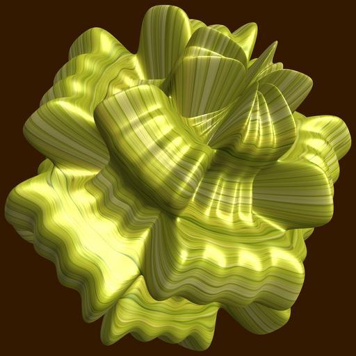 Keywords: mathematica cg 3d sphericalplot3d texture code program algorithm コード プログラム アルゴリズム geometric sculpture geometricsculpture shape geometry sculpture mapping テクスチャ マッピング 模様 もよう abstract 抽象 ちゅうしょう アブストラクト design pattern デザイン パターン graphic グラフィック グラフィクス structure 意匠 構造 symmetry 対称性 たいしょうせい シンメトリー 対称 たいしょう algorithm コード indoor a = 2; b = 6; c = 3; SetOptions[SphericalPlot3D, Axes -> None, Mesh -> None, Boxed -> False, PlotStyle -> Directive[Specularity[White, 30], Texture[Import["D:/tmp/71.jpg"]]], TextureCoordinateFunction -> ({b #4, #5/c} &), Lighting -> "Neutral", Background -> Darker[Orange, 0.8], ImageSize -> 3000, PlotPoints -> 400]; f[v_] := Sin[2 Sin[Sin[Sin[v]]]]; g[v_] := Sum[Sin[(2 k - 1) v]/(2 k), {k, 4}]; SphericalPlot3D[a + f[b p] g[c q], {p, 0, Pi}, {q, 0, 2 Pi}] (*--- The Texture *) a = 2; b = 6; c = 3; SetOptions[SphericalPlot3D, Axes -> None, Mesh -> None, Boxed -> False, PlotStyle -> Directive[Specularity[White, 30], Texture[Import["D:/tmp/71.jpg"]]], TextureCoordinateFunction -> ({b #4, #5/c} &), Lighting -> "Neutral", Background -> Darker[Orange, 0.8], ImageSize -> 3000, PlotPoints -> 400]; f[v_] := Sin[2 Sin[Sin[Sin[v]]]]; g[v_] := Sum[Sin[(2 k - 1) v]/(2 k), {k, 4}]; SphericalPlot3D[a + f[b p] g[c q], {p, 0, Pi}, {q, 0, 2 Pi}] (*--- The Texture *) |