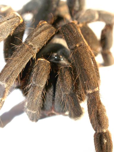Keywords: spider tarantula arthropod photography hairy mexican redknee tarantula brown orange carapace color image female abdomen studio shot white background legs ground venomous birdman animal