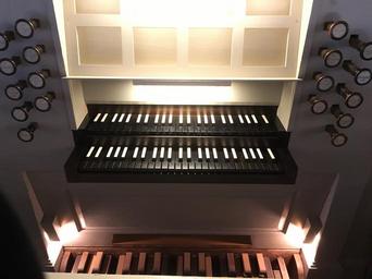 Keywords: Spieltisch Engelhardt-Orgel Wollershausen.JPG de Der Spieltisch der Orgel mit beiden Manualen und den Registerzügen mit den handgeschriebenen Registernamen own Yannick Bode 2016-04-07 Cc-zero St -Marien-Kirche Wollershausen