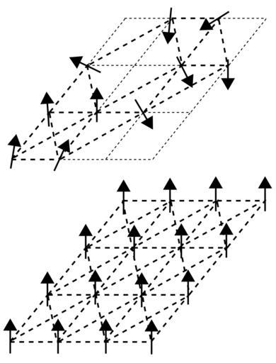 Keywords: Spin glass by Zureks.svg en Orientation of magnetic moments in a single crystal plane for spin glasses top and for ferromagnets bottom Arrows represent orientation of magnetic moments thick dashed lines - interactions between neigbours thin dashed lines - crystal structure Drawing based on Peter Young Spin glasses and random fields World Scientific Publishing Singapore 1998 ISBN 9810232403 page 100 own Zureks 2010 Ferromagnetism cc-zero |