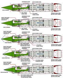 Keywords: SR71 J58 Engine Airflow Patterns.svg Pratt Whitney J58 engine of the SR71 Blackbird as the speed increases from zero to Mach 3 2 This image is based on Figure 1 21 from the SR-71 Flight Manual Original drawing at http //www sr-71 org/blackbird/manual/1/1-33 php SVGd by uploader Inductiveload 2009-01-31 PD-USGov Pratt Whitney J58 |