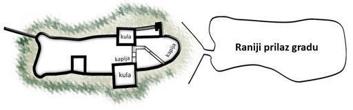 Keywords: Srednjovjekovni grad Visoki obrada.png Tlocrt srednjovjekovnog grada i tvrđave Visoki Plan of the royal town Visoki Kula Tower Kapija Gate Raniji prilaz gradu Early path to the gates of town 2006-08-30 own assumed Mhare Old town of Visoki Diagrams in Bosnian |