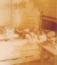 Keywords: Srkelly.jpg Police photograph of the murder scene of Mary Jane Kelly the 5th canonical victim of Jack the Ripper Foto policial de la escena del asesinato de Mary Jane Kelly la quinta víctima de Jack el Destripador Polizeiphoto des Tatortes von Mary Jane Kelly dem fünften Opfer von Jack the Ripper Фотог афия убитой э и Джейн Келли 5-й же твы Джека Пот ошителя сделанная полицией на месте п еступления Cinayetin Polis Tarafından çekilmiş fotoğrafı Mary Jane Kelly Karındeşen Jack tarafından katledilen 5 kurbandır Donated to the Public Record Office Kew Reference MEPO 3/3155 in 1988 from an anonymous private collection presumed to originate from the City of London police archives Ref No NSY/MJK1 Not published before 1988 see http //www casebook org/dissertations/dst-kelly html Casebook Jack the Ripper A similar or identical picture was published on page 257 of Vacher l'Eventreur et les Crimes Sadiques 1899 by Alexandre Lacassagne Lyons/Paris see Casebook; and pdf of the page from the original French publication http //gallica bnf fr/ark /12148/bpt6k77016g image f270 City of London police 1888-11-09 This image is in the public domain in the United Kingdom because it was first published more than 70 years after its creation and so was in the public domain at the time of first publication http //www copyrightservice co uk/copyright/p01_uk_copyright_lawhttp //www museumscopyright org uk/private pdf This image is in the public domain in the United States because it is an anonymous or corporate work created over 120 years ago that was published without a copyright notice and without a subsequent copyright registration and was in the public domain in its country of origin at the time of first publication PD-old Mary Jane Kelly