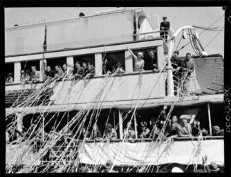 Keywords: samuel j hood collection samueljhoodcollection hood collection hoodcollection hood morinda burns philp burnsphilp mystery island mysteryisland australian film australianfilm talkie cast crew producer director actors actresses brian abbot brianabbot leslie hay simpson lesliehaysimpson desmond hay desmondhay george rikard bell georgerikardbell grace rikard bell gracerikardbell jean mort jeanmort jean laidley jeanlaidley lost at sea lostatsea motor skiff motorskiff motor launch motorlaunch mystery star mysterystar george doran georgedoran jonas alfred lipman jonasalfredlipman joe lipman joelipman george d malcolm georgedmalcolm farewell streamers vintage vintage clothing vintageclothing 1930s fashion 1930sfashion 1930s women's fashion 1930swomensfashion 1930s women's clothing 1930swomensclothing blackandwhite monochrome photo border outdoor black and white This photograph depicts the cast and crew members of the Australian film Mystery Island (1937) on board SS MORINDA. The cast and crew were sailing from Walsh Bay, Sydney to Lord Howe Island to shoot the film. Shortly after shooting the film, George Rikard Bell (screen name Brian Abbot) and a fellow cast mate, Leslie Hay Simpson (screen name Desmond Hay), decided to forego the trip back to Sydney on board MORINDA and opted to sail on board the 16-foot motor skiff, MYSTERY STAR. The two were never seen again. Please see our blog for an extended version of the story. This photo is part of the Australian National Maritime Museum’s Samuel J. Hood Studio collection. Sam Hood (1872-1953) was a Sydney photographer with a passion for ships. His 60-year career spanned the romantic age of sail and two world wars. The photos in the collection were taken mainly in Sydney and Newcastle during the first half of the 20th century. The ANMM undertakes research and accepts public comments that enhance the information we hold about images in our collection. This record has been updated accordingly. Photographer: Samuel J. Hood Studio Collection Object no. 00022880 This photograph depicts the cast and crew members of the Australian film Mystery Island (1937) on board SS MORINDA. The cast and crew were sailing from Walsh Bay, Sydney to Lord Howe Island to shoot the film. Shortly after shooting the film, George Rikard Bell (screen name Brian Abbot) and a fellow cast mate, Leslie Hay Simpson (screen name Desmond Hay), decided to forego the trip back to Sydney on board MORINDA and opted to sail on board the 16-foot motor skiff, MYSTERY STAR. The two were never seen again. Please see our blog for an extended version of the story. This photo is part of the Australian National Maritime Museum’s Samuel J. Hood Studio collection. Sam Hood (1872-1953) was a Sydney photographer with a passion for ships. His 60-year career spanned the romantic age of sail and two world wars. The photos in the collection were taken mainly in Sydney and Newcastle during the first half of the 20th century. The ANMM undertakes research and accepts public comments that enhance the information we hold about images in our collection. This record has been updated accordingly. Photographer: Samuel J. Hood Studio Collection Object no. 00022880 |