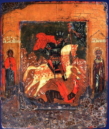 | Keywords: St. George with Paraskeva and Saint Nicholas XVII.jpeg ru Чудо святого Гео гия о змие с Па аскевой пятницей и иколой Чудотво цем на полях 17 век Русский Севе Де ево левкас темпе а 29 3х24 6 см Иконог афическая особенность - п и наличии венца над головой Гео гия отсутствует изоб ажение ангела несущего венец имб Гео гия не был изоб ажен; иконописец лишь наметил его левый к ай конту ом плаща святого Гео гий де жит копье в левой уке повод - в п авой century 17 http //www bibliotekar ru/rusIcon/31 htm 17 PD-Art-100 Icons of Saint George and the Dragon 1600 Uploaded with UploadWizard Icons of Russian North Icons with saints on the margins Damaged icons |