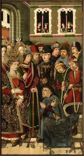 | Keywords: St-helena-questioning-judas-jimenez-bernalt-spain-1480s.jpg Holy Cross Retablo de la Santa Cruz ; Church of Blesa Aragon Spain This panel shows Saint Helena questioning Judas about the location of the True Cross Helena wears a trigregnum symbolizing that she represents the Catholic Church and making the image a parallel of the Holy Inquisition Spanish-gothic style; oil on wood c 1481-1487 Museo de Zaragoza http //www museodezaragoza es/gotico/ Miguel Jimenez and Martin Bernalt s 1480 PD-old-100 <gallery> File Jimenez-santa_helena_y_judas JPG Smaller version File St -HelenaInterrgogatingJudas jpg Smaller version File JewInterrogation JPG Detail of Judas </gallery> Helena of Constantinople and the finding of the True Cross Altar paintings 15th-century religious paintings in Spain Miguel Ximénez Martín Bernat |