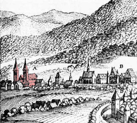 | Keywords: St. Paulin und St. Maximin (Stich von Merian) mit Stadtmauer.jpg St Paulin links und die Reichsabtei St Maximin Mitte außerhalb von Trier Stadtmauern rechts unten Ausschnitt aus einem Stich aus dem Buch žTopographia Archiepiscopatuum Moguntinensis von 1646 Ansicht vermutlich von 1548 siehe Kommentar auf image De Merian Mainz Trier Köln 045 jpg “ Die Einfärbung stammt nicht von dem Originalstich und wurde ergänzt um den Bau hervorzuheben St Paulin left and St Maximin's Abbey middle outside of the German town Trier defensive walls on the lower right Part of an engraving from the 1646 book Topographia Archiepiscopatuum Moguntinensis The view is probably taken from 1548; see commentary on image De Merian Mainz Trier Köln 045 jpg - The coloration is not from the original engraving and was added to highlight the building Trèves Allemagne à droite Partie d'une gravure du livre «Topographia Archiepiscopatuum Moguntinensis» de 1646 Cette vue est probablement de 1548; voir commentaire sur image De Merian Mainz Trier Köln 045 jpg en anglais et allemand “ La colorisation n'origine pas de la gravure et a été ajouté pour faire ressortir le batiment de Scan eines historischen Buchs durch http //www digitalis uni-koeln de/digitaletexte html applies as for the image with highlighting <br/> Image De Merian Mainz Trier Köln 045 jpg image before cropping ;<br> Image St Paulin Stich von Merian jpg smaller part of the original image features only St Paulin without St Maximin nor the defensive walls of Trier <br> Image St Paulin und zentral St Maximin Stich von Merian mit Stadtmauer jpg St Paulin and St Maximin with a part of the defensive walls of Trier focussing more on St Maximin PD-old-100 Merian-Stich Trier City walls in Rhineland-Palatinate St Paulin Trier St Maximin Trier |