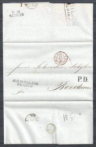 | Keywords: St Petersburg 1849 Dob0102306.jpg en Russia stampless folded letter to France 'St PETERSBURG DEN 25 MAR 1849 ' boxed cancel manuscript 'fco' Black 'P D ' straight line 'AUS RUSSLAND FRANCO' French 'PRUSSE VALENCIENNES 15 AVRIL 49' c d s Bordeaux 17 AVRIL 49 arrival Details March 25 1849 Julian new year's day paid letter posted at St Petersburg Sender wrote 'fco' Not restated at post office The postmark 'St PETERSBURG DEN 25 MAR 1849' was applied Dobin 1 02 type 3 06 Reception expedition of foreign correspondence used 1844-1853 Rarity 4 <ref> cite book Manfred Dobin Postmarks of Russian Empire Pre adhesive period St Petersburg Standard Kollektion 1993 9785853870222 </ref> April 12 Gregorian 'BERLIN 12 4' typical Berlin transit postmark and 'AUS RUSSLAND FRANCO' applied Based on the usual presence of these Berlin postmarks this 'AUS RUSSLAND FRANCO' marking is regarded as a Berlin mark White Aus Russland type B3 April 15 brownish red 'PRUSSE VALENCIENNES 15 AVRIL 49 3' French entry mark at Valenciennes 3's show the postmark was struck at Paris Letter was also marked by the French with 'P D ' Payee au Destination Noël 1021<ref> cite book Gilbert Noël Catalogue des oblitérations des chiffres-taxe carrés de France 1859-1878 1956 Paris E H de Beaufond </ref> No transit postmark but likely transit in Paris on April 15 April 17 'BORDEAUX 17 AVRIL 32 ' receipt backstamp 1849 Scan of original Postal authorities Sources reflist PD-old-100 Stampless covers of Russia Marque d'entrée en France Gare de Valenciennes Postmarks of Saint Petersburg Entry and transit postmarks of Germany 1849 postmarks |