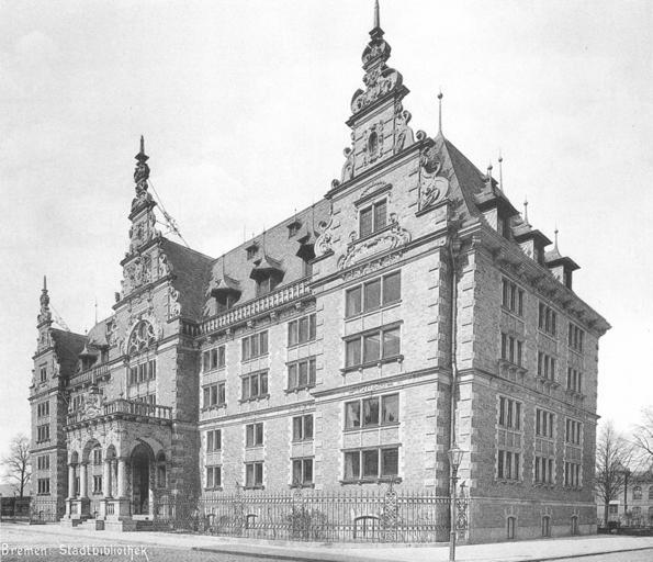 | Keywords: Stadtbibliothek - Bremen - 1897.jpg en The former city library later state library in Bremen Germany at the Breitenweg street near the central train station The neo-renaissance building by Johann Georg Poppe with three gabels was constructed in the year 1897 and severly damaged in an air raid in 1942 de Die ehemalige Stadtbiliothek später Staatsbibliothek in Bremen am Breitenweg nahe dem Hauptbahnhof Der Bau von Johann Georg Poppe im Stile der Neorenaissance mit drei Giebeln wurde 1897 errichtet und 1942 bei einem Bombenangriff schwer beschädigt Herbert Schwarzwälder Bremen “ ein verlorenes Stadtbild Wartberg Verlag Gudensberg-Gleichen 1994 author ca 1897 PD-old Libraries in Bremen Johann Georg Poppe Built in Bremen state in 1897 Destroyed in Germany in 1942 Former buildings and structures of Bremen Neo-Renaissance architecture in Bremen state 1897 in Bremen |