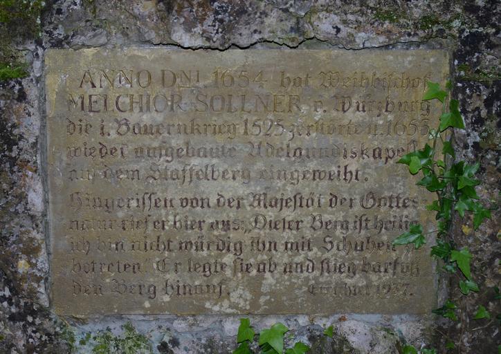 Keywords: Staffelberg Gedenktafel 001.JPG Gedenktafel auf einem Felsbrocken auf dem Staffelberg Text ANNO D<u>NI</u> 1654 hat Weihbischof MELCHIO SÖLLNER v Würzburg die i Bauernkrieg 1525 zerstörte u 1653 wieder aufgebaute Adelgundiskapelle auf dem Staffelberg eingeweiht Hingerissen von der Majestät der Gottesnatur rief er hier aus žDieser Berg ist heilig ich bin nicht würdig ihn mit Schuhen zu betreten Er legte sie ab und stieg barfuß den Berg hinauf Errichtet 1937 own Janericloebe 2010-05 Adelgundiskapelle Staffelberg Plaques in Bavaria |