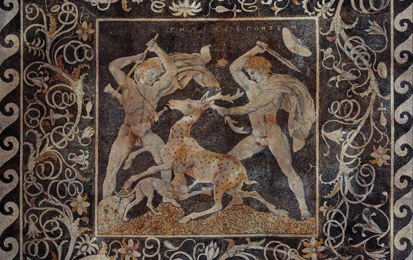 Keywords: Stag hunt mosaic, Pella.jpg Stag hunt mosaic Pella Greece Mosaïque de la chasse au cerf Pella Grèce http //i imgur com/hcgYEdC jpg circa 340 BCE author Stag hunt mosaic Pella Greece 18 34 28 October 2014 UTC Stag hunt mosaic Pella jpg PD-old-100 Stag hunt mosaic Pella Valued images by Yann Forget |