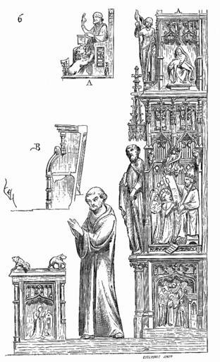 Keywords: Stalles.abbaye.Saint.Claude.Jura.2.png La figure 6 montre l'une des jouées des formes hautes et basses avec l'entrée entre elles deux Les bas-reliefs se détachent sur des fonds pleins ou ajourés; des statuettes décorent richement trop richement même ces jouées En B est tracé le profil des stalles basses Malgré la profusion des détails dans cette figure comme dans la précédente le principe de la structure de bois est toujours apparent Mais dans leurs compositions les plus riches jamais les artistes du moyen âge n'ont failli à ce principe qu'il s'agisse de la maçonnerie de la charpente de la serrurerie ou de la menuiserie Viollet-le-Duc Drawings by Eugène Viollet-le-Duc |