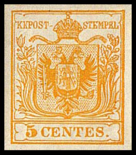 | Keywords: StampLombardiaVenetia1850Michel1.jpg ru Пе вая почтовая ма ка Ломба до-Венецианского ко олевства de Neudruck Mi 1 ND personal collection Postal administration of Lombardy-Venetia 1866-1894 Reprint not original issue Could be between 1866 and 1894 7 official reprints in this period cc-zero 1850 stamps of Lombardy-Venetia Definitive stamps of Italy Coats of arms on stamps | ||||