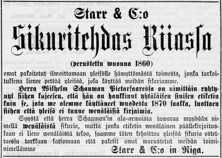 Keywords: Starr and Co in Riga.jpg Advertisement for Chicory Cichorium intybus by Starr C o in Riga warning the public about inferior products of their competitor Wilhelm Schauman of Jakobstad The advertisement appeared in multiple Finnish newspapers in 1886 in both Finnish and Swedish newspaper Aura no 122 - http //digi lib helsinki fi/sanomalehti/secure/showPage html action page type lq id 88996 pageFrame_currPage 4 Historical Newspaper Library 1886-10-19 Starr C o in Riga PD-old Text Starr C o Sikuritehdas Riiassa Perustettu vuonna 1860 owat pakotetut ilmoittamaan yleisölle häwyttömästä toimesta jonka tarkoi- tuksena lienee pettää yleisöä joka käyttää meidän sikariamme <b>Herra Wilhelm Schauman Pietarsaaresta on nimittäin ryhty- nyt siihen kujeeseen ettähän on hankinut yhtäläisen sinisen etiketin kuin se jota me olemme käyttäneet vuodesta 1870 saakka luottaen siihen että yleisö ei tunne wenäläisiä kirjaimia </b> Syystä että herra Schauman'in ala-arwoista tawaraa myydään ni- mellä <b>wenäläistä</b> sikuria mutta jonka etiketin wenäläinen päällekirjoitus- kaan ei liene wenäläistä tekoa saamme täten kehoittaa yleisöä sikuria ostet- taessa tarkkaan katsomaan että paketit owat warustetut meidän toimi- nimellämme Starr C o in Riga Response by Wilh Schauman <gallery> Image Jakobstads-Cikoria jpg </gallery> Chicory Schauman Products of Latvia 1886 advertisements Finnish language Food and drink advertising
