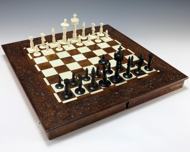 | Keywords: State Gifts Chess Set.JPG en A hand-turned and carved ivory chess set containing 16 black and 16 white pieces The chessboard is made of wood with ornate floral carvings around the playing surface The playing surface has alternating squares of ivory and wood inlay The board is hinged in the center for storage and inside is lined with red velvet Gift of Zulfikar Ali Bhutto Prime Minister of Pakistan ivory 1 25 H x 14 W x 14 D Institution Gerald R Ford Presidential Museum http //www fordlibrarymuseum gov/museum/ArtifactCollectionSamples/Catagories/StateGifts/ChessSet html Chess set accession number 1987 100 1 credit line Courtesy of the Gerald R Ford Presidential Museum Donation Date February 5 1975 Institution Institution Gerald R Ford Presidential Museum Gerald R Ford Presidential Library and Museum-cooperation PD-USGov Uploaded with UploadWizard Gifts of heads of state in the Gerald R Ford Presidential Museum Chess sets Relations of Pakistan and the United States 19th-century chess |