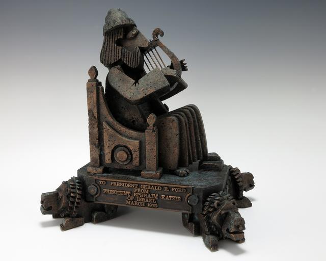 | Keywords: State Gifts Sculpture.JPG en Contemporary bronze sculpture depicting King David playing a harp while seated at his throne The statue is mounted on a square base with four sculpted lions serving as feet for the base of the throne The artist Frank Meisler engraved his name at the base There are two plaques mounted to opposite sides of the base with the words To President Gerald R Ford from President Ephraim Katzir of Israel March 1975 in both English and Hebrew Gift of President Ephraim Katzir of Israel bronze 15 H x 12 5 W Institution Gerald R Ford Presidential Museum http //www fordlibrarymuseum gov/museum/ArtifactCollectionSamples/Catagories/StateGifts/IsraeliSculpture html Bronze sculpture accession number 1987 108 1 credit line Courtesy of the Gerald R Ford Presidential Museum Donation Date March 5 1975 Institution Institution Gerald R Ford Presidential Museum Gerald R Ford Presidential Library and Museum-cooperation PD-USGov Uploaded with UploadWizard Gifts of heads of state in the Gerald R Ford Presidential Museum Sculptures of David Relations of Israel and the United States |