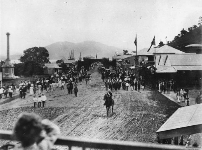 | Keywords: StateLibQld 1 104384 Street procession in Cooktown, Queensland, ca. 1889.jpg en Street procession in Cooktown Queensland ca 1889 Street procession for the visit of Sir Henry Norman to Cooktown ca 1889 People have gathered onto the street in front of the War Memorial and shops to view the procession led by the marching band circa 1889 handle 10462/deriv/90292 Item is held by John Oxley Library State Library of Queensland PD-Australia StateLibQld-License Architecture of Australia Streets in Cooktown 1889 in Queensland Black and white photographs Parades in Australia |