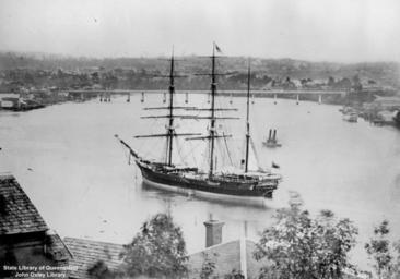 Keywords: StateLibQld 1 105604 Indus (ship) anchored in the South Reach of the Brisbane River, Brisbane, 1876.jpg en Indus ship anchored in the South Reach of the Brisbane River Brisbane 1876 View of the Indus at anchor in the Brisbane River The first permanent Victoria Bridge which had a revolving mechanism to allow shipping to pass through can be seen in the background The view is looking from River Terrace South Brisbane with the city on the right of the bridge The Indus was built in 1847 and weighed 1 319 tons The ship was built as a steamer but was later converted into a sailing vessel Between 1870 and 1876 it made six voyages to Moreton Bay with immigrants on board 1876 handle 10462/deriv/92464 Item is held by John Oxley Library State Library of Queensland PD-Australia StateLibQld-License Barques Sailing ships of Australia First Victoria Bridge Brisbane Brisbane River Indus ship 1847 Ships in Brisbane 1876 in Brisbane Black and white photographs |