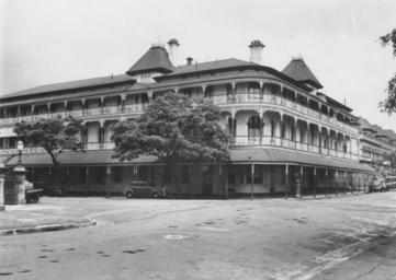 | Keywords: StateLibQld 1 112000 Bellevue Hotel, Brisbane, 1940.jpg en Bellevue Hotel Brisbane 1940 <br /> The Bellevue Hotel was erected in 1886 occupying the site on the corner of George and Alice Streets Brisbane Queensland The building was of three storey construction featuring cast iron railing on the wrap around verandahs with posts supporting a curved corrugated iron roof A steep pitched roof shows two mansard roofs with cast iron cresting and chimneys In April 1979 under instruction from Premier Joh Bjelke-Petersen the building was demolished after midnight by local contractors the Deen Brothers who had police protection A crowd of over 700 protestors looked on in horror after failing to save the beautiful old building 1940 handle 10462/deriv/130744 Item is held by John Oxley Library State Library of Queensland PD-Australia StateLibQld-License Bellevue Hotel Brisbane Streets in Brisbane CBD Railings in Queensland Vehicles in Australia 1940 in Brisbane Black and white photographs |