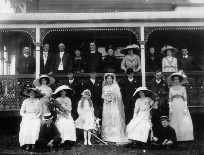 Keywords: StateLibQld 1 116840 Fashionable wedding group, ca. 1911.jpg en Fashionable wedding group ca 1911 Bridesmaids and women guests wore elaborate hats to this wedding ca 1911 Bridesmaids carry long handled bouquets The Minister stands with older family members on the verandah circa 1911 handle 10462/deriv/139987 Item is held by John Oxley Library State Library of Queensland PD-Australia StateLibQld-License Brides of Australia Headgear of Australia People wearing hats Flower girls Flower bouquets in Australia Women's clothing of Australia Black and white photographs |