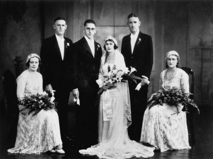Keywords: StateLibQld 1 122307 Fresh floral bouquets for the bride and bridesmaids, 1932.jpg en Fresh floral bouquets for the bride and bridesmaids 1932 Bride in traditional satin gown is attended by bridesmaids wearing figured lace gowns with small bolero jackets and a cap made of matching material 1932 handle 10462/deriv/3091 Item is held by John Oxley Library State Library of Queensland PD-Australia StateLibQld-License Wedding parties Wedding dresses in Australia Brides of Australia Grooms of Australia Men's clothing of Australia Bridesmaids of Australia 1932 in Queensland Black and white photographs 1932 weddings |