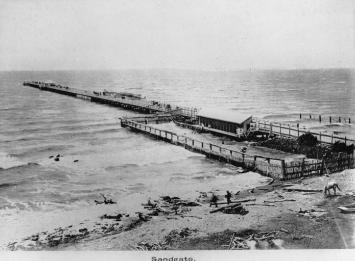 | Keywords: StateLibQld 1 126419 Sandgate Pier, Brisbane, 1901.jpg en Sandgate Pier Brisbane 1901 Far view of the Sandgate pier in 1901 The wooden pier has a protected swimming enclosure at one side A horse stands on the debris strewn beach 1901 handle 10462/deriv/80743 Item is held by John Oxley Library State Library of Queensland PD-Australia StateLibQld-License Beaches of Queensland Sandgate Pier 1901 in Queensland Black and white photographs | ||||