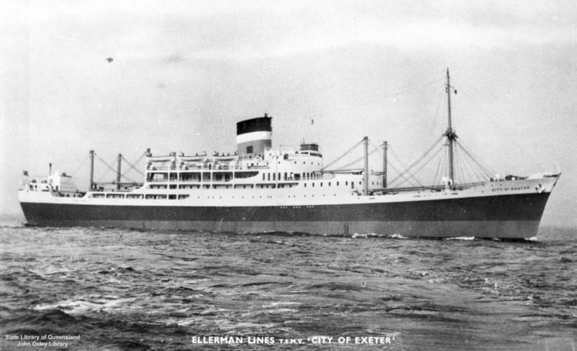 | Keywords: StateLibQld 1 129289 City of Exeter (ship).jpg Ellerman Lines' 13 343 GRT cargo liner MV City of Exeter built in 1953 by Vickers Armstrong in Newcastle-upon-Tyne She was sold in 1971 to Michael Karageorgis who converted her into a car ferry and renamed her Mediterranean Sea She was sold to Turkish owners in 1995 renamed Tutku and again to Greek owners in 1996 becoming Alice She was scrapped at Aliaga Turkey in 1998 handle 10462/deriv/83532 Item is held by John Oxley Library State Library of Queensland PD-Australia StateLibQld-License Black and white photographs of ships City of Exeter ship 1953 Ships in Queensland |