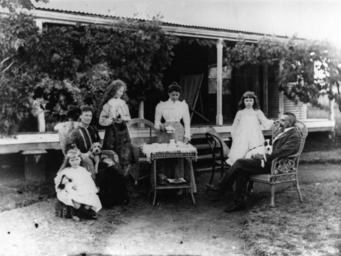 Keywords: StateLibQld 1 137422 Tea party in the garden, possibly at Nanango, 1900-1910.jpg en Tea party in the garden possibly at Nanango 1900-1910 Family tea party on the drive in front of a house at Nanango 1900-1910 The group is well-dressed The furniture includes a cane table and some cane chairs A girl sits at the front to the left and holds a doll A man and a woman sit in chairs and each have a dog on their laps A woman standing in the centre of the group is pouring tea Creepers cover the verandah of the house A deck chair and water tank can be seen on the verandah between 1900 1910 handle 10462/deriv/9643 Item is held by John Oxley Library State Library of Queensland PD-Australia StateLibQld-License Children of Queensland Clothing of Australia Groups of people in Australia Tea parties Veranda furnishings Queensland 1900 in Australia Black and white photographs People with dogs Tea on the veranda Queensland |