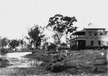 | Keywords: StateLibQld 1 138587 Leo Hotel moving along Lime Street, Clermont, 1917.jpg en Leo Hotel moving along Lime Street Clermont 1917 Following the flood that virtually destroyed Clermont in December 1916 the people of Clermont voted to move the town to higher ground 'Each building was raised on jacks and timber rails laid underneath it and for about one hundred metres ahead A steam traction engine then winched the building slowly along the track When it came to the end of the track the rails were collected and laid down in front for another hundred metres Considering the size of the task of moving a hotel the procedure did not take long The contract to move the Grand Hotel was signed in June 1917 the steam engine began its work on 16 August and by 15 September the Grand was opposite its new site on the corner of Capella and Daintree Streets While the hotel was 'on the road' the boarders had their meals served in the dining room as usual and slept in their rooms each night The other hotels were also moved in this way although the Commercial being so large and built in an 'L' shap plan was sawn in half and moved in two sections Other buildings moved by traction engine included several houses and Griffin's store ' Information taken from G C Pullar A shifting town glass-plate images of Clermont and its people 1986 Town Hall in background and lagoon on the left 1917 handle 10462/deriv/12273 Item is held by John Oxley Library State Library of Queensland Pullar Gordon C PD-Australia StateLibQld-License Floods in Queensland Hotels and pubs in Clermont Queensland Lagoons of Queensland Steets in Clermont 1917 in Queensland Black and white photographs Transport of buildings |