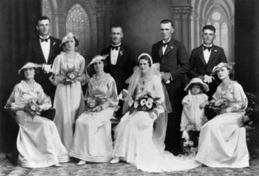 | Keywords: StateLibQld 1 140295 Portrait of a wedding party, 1930-1940.jpg en Portrait of a wedding party 1930-1940 The bride is seated and holds a bouquet She is wearing a full length wedding grown with a long trailing veil The bridesmaids are wearing long dresses carrying bouquets of flowers and wearing hats The groom best man and groomsmen are all dressed in suits and bow ties and wear a floral buttonhole A flower girl is also part of the wedding party between 1930 1940 handle 10462/deriv/19211 Item is held by John Oxley Library State Library of Queensland PD-Australia StateLibQld-License Wedding parties 1930 in Australia Portraits of Queensland Wedding ceremonies in Australia Women's clothing of Australia Flower girls Brides of Australia Grooms of Australia Flower bouquets in Australia Men's clothing of Australia Black and white photographic portraits Buttonhole flowers |