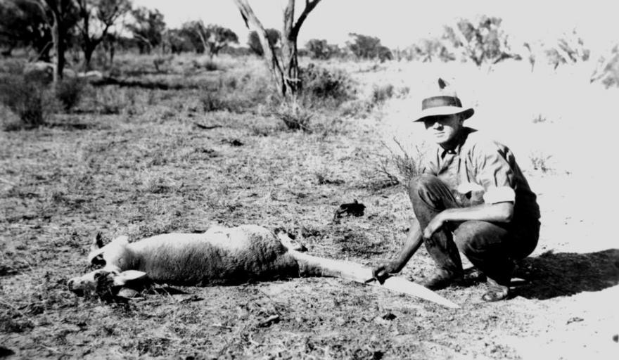Keywords: StateLibQld 1 166063 Kangaroo hunting, Thylungra, 1924.jpg en Kangaroo hunting Thylungra 1924 Man posing with a dead kangaroo at Thylungra in 1924 The man is holding a knife suggesting he may be about to skin the animal 1924-08-01 handle 10462/deriv/112722 Item is held by John Oxley Library State Library of Queensland PD-Australia StateLibQld-License people in 1924 Unidentified Macropus Farms in Australia 1924 in Australia Black and white photographs Hunting in Australia Dead kangaroos Kangaroo hunting Hunters with their kill |