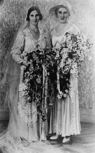 Keywords: StateLibQld 1 174563 Bride, Julia Drynan, and her attendant, Eva Drynan, ca. 1930.jpg en Bride Julia Drynan and her attendant Eva Drynan ca 1930 Julia Drynan married Jack Enright ca 1930 circa 1930 handle 10462/deriv/101242 Item is held by John Oxley Library State Library of Queensland PD-Australia StateLibQld-License Portraits of Queensland Brides of Australia Bridesmaids of Australia Wedding dresses in Australia Headgear of Australia People with hats Flower bouquets in Australia Black and white photographs |