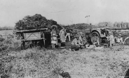Keywords: StateLibQld 1 179463 Peanut Threshing, Durong, 1920-1930.jpg en Peanut Threshing Durong 1920-1930 A group of people are taking a break during peanut threshing at a farm in Durong Hilda Dora and Rene Morris are standing at the left of the group near a wagon laden with peanuts Alf Morris is kneeling on the far right near the tractor with a cup in his hand between 1920 1930 handle 10462/deriv/102794 Item is held by John Oxley Library State Library of Queensland PD-Australia StateLibQld-License Manual workers of Australia Farmers from Australia Tractors in Queensland Wagons in Australia 1920 in Australia Black and white photographs |