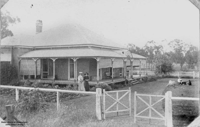 | Keywords: StateLibQld 1 184703 Garden scene at Brook Farm, 1908.jpg en Garden scene at Brook Farm 1908 A low set timber dwelling with French doors opening onto a wrap around verandah The house has a steep pitched roof line with a brick chimney visible Two women are standing in the garden A park rail fence surrounds the house and garden 1908 handle 10462/deriv/128740 Item is held by John Oxley Library State Library of Queensland PD-Australia StateLibQld-License Queenslander architecture Gardens in Queensland Fences in Queensland Architecture of Queensland Women's clothing of Australia Farmers from Australia 1908 in Australia Black and white photographs Images from The Queenslander |