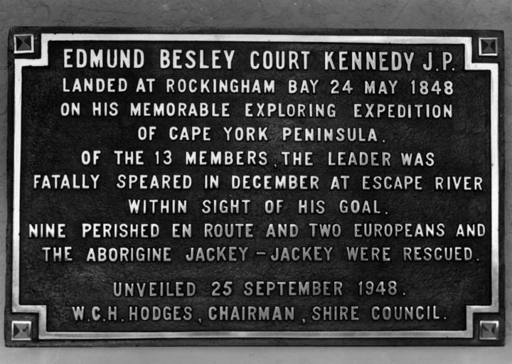 Keywords: StateLibQld 1 191355 Memorial plaque for Edmund Kennedy, Rockingham Bay, 1948.jpg en Memorial plaque for Edmund Kennedy Rockingham Bay 1948 In 1848 the Assistant-Surveyor of New South Wales Edmund Kennedy led an expedition to explore Cape York Peninsula In the previous year he had discovered the Thomson River and established that the Barcoo River was part of Cooper's Creek Arriving at Rockingham Bay north of Townsville in May Kennedy's party after much privation and toil reached Weymouth Bay where they established a depot Kennedy with four others Costigan Dunn Luff and a indigenous Australian Jacky Jacky left this depot in an endeavour to reach Cape York where a relief ship was expected 1948 handle 10462/deriv/114373 Item is held by John Oxley Library State Library of Queensland PD-Australia StateLibQld-License Edmund Kennedy Monuments and memorials in Queensland 1948 in Australia New South Wales Black and white photographs |