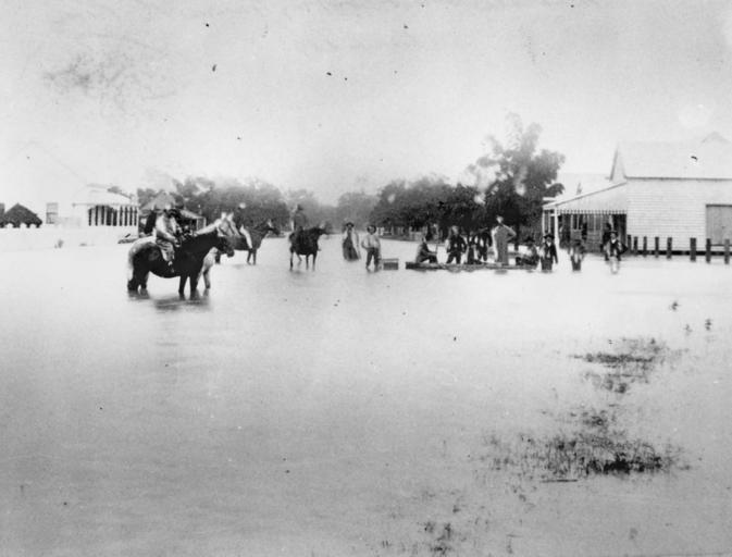 | Keywords: StateLibQld 1 193535 Floods in the town of Goondiwindi, 1890.jpg en Floods in the town of Goondiwindi 1890 Marshall street is awash with flood water forcing people to wade or ride horses after the flooding of the Macintyre River 1890 handle 10462/deriv/113931 Item is held by John Oxley Library State Library of Queensland PD-Australia StateLibQld-License Floods in Goondiwindi 1890 in Queensland Black and white photographs 1890 floods | ||||