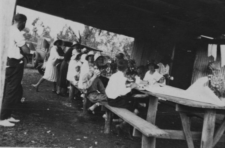 | Keywords: StateLibQld 1 195791 Social lunch at the Kingaroy Rifle Club, ca. 1930.jpg en Social lunch at the Kingaroy Rifle Club ca 1930 Wifes and families enjoying a picnic lunch on a competition day at the Kingaroy Rifle Club circa 1930 handle 10462/deriv/114869 Item is held by John Oxley Library State Library of Queensland PD-Australia StateLibQld-License Picnics in Australia Children of Queensland Women's clothing of Australia Kingaroy Black and white photographs | ||||
