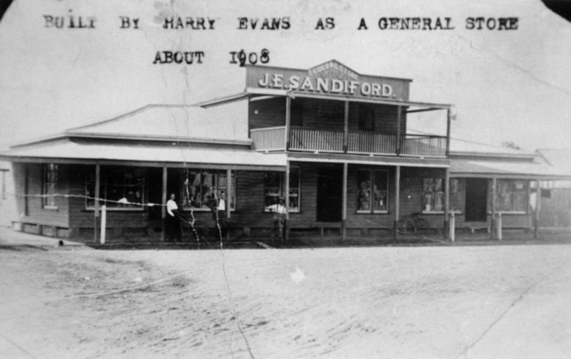 | Keywords: StateLibQld 1 200679 General store in Inglewood, ca. 1908.jpg en General store in Inglewood ca 1908 This is the J E Sandiford Federal Store which was built by Harry Evans and is a two storey structure with a balcony on the second floor There are three men posing on the verandah and a bicycle leaning against the shop front The street in front of the store is unpaved circa 1908 handle 10462/deriv/96607 Item is held by John Oxley Library State Library of Queensland PD-Australia StateLibQld-License General stores in Queensland Verandas on Queensland shops 1908 in Australia Black and white photographs Inglewood Queensland |