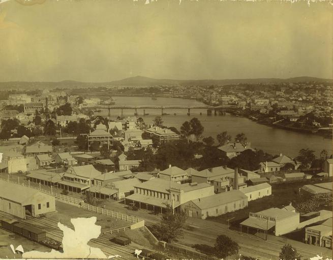 Keywords: StateLibQld 1 235491 Roma Street between the railway yards and the Brisbane River, 1897.jpg en Roma Street between the railway yards and the Brisbane River 1897 Taken from the chimney of the new power house at the Countess Street tram depot Photograph features a view of the Brisbane River and the Victoria Bridge The suburb of South Brisbane is to the centre right of the photograph See also image numbers APO-023-0001-0001; APO-023-0001-0002; APO-023-0001-0004; APO-023-0001-0005 1897 handle 10462/deriv/39568 Item is held by John Oxley Library State Library of Queensland PD-Australia StateLibQld-License Cityscapes in Queensland Second Victoria Bridge Brisbane Shops in Queensland Brisbane River Roma Street Brisbane 1897 in Brisbane Black and white photographs |