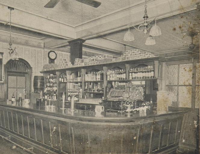 | Keywords: StateLibQld 1 246561 Bar area of Vallely's Hotel Australian, Brisbane, ca. 1910.jpg en Bar area of Vallely's Hotel Australian Brisbane ca 1910 The bar is made of timber which has a curved end Shelves behind the bar are stocked with a wide selection of bottled alcohol circa 1910 handle 10462/deriv/35617 Item is held by John Oxley Library State Library of Queensland PD-Australia StateLibQld-License Ceiling light fixtures in Australia 1910 in Australia Black and white photographs Hotel Australian Brisbane |